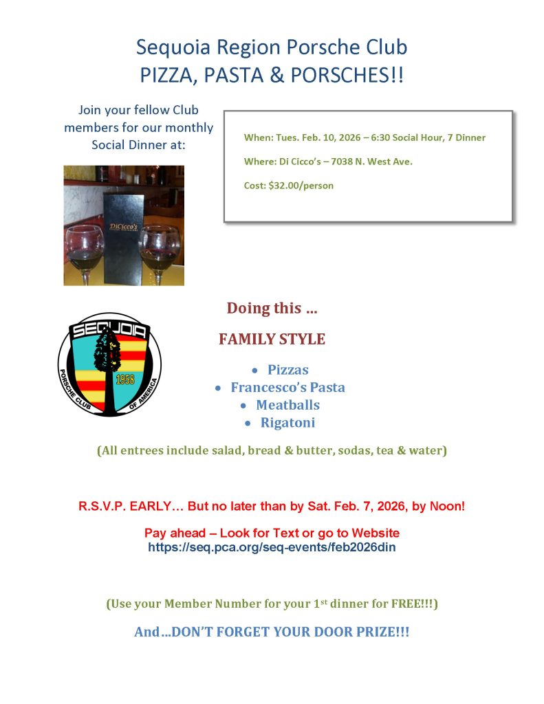 Feb Dinner @ DiCiccos 01.07.2026 by // Feb Dinner @ DiCiccos 6:30 pm – 8:30 pmFebruary 10, 2026 come join us for dinner @DiCiccos! Dinner Step 1 of 2 50% Name(Required) First Last Email(Required) Mobile Phone(Required)Please enter your address(Required) Street Address Address Line 2 City AlabamaAlaskaAmerican SamoaArizonaArkansasCaliforniaColoradoConnecticutDelawareDistrict of ColumbiaFloridaGeorgiaGuamHawaiiIdahoIllinoisIndianaIowaKansasKentuckyLouisianaMaineMarylandMassachusettsMichiganMinnesotaMississippiMissouriMontanaNebraskaNevadaNew HampshireNew JerseyNew MexicoNew YorkNorth CarolinaNorth DakotaNorthern Mariana IslandsOhioOklahomaOregonPennsylvaniaPuerto RicoRhode IslandSouth CarolinaSouth DakotaTennesseeTexasUtahU.S. Virgin IslandsVermontVirginiaWashingtonWest VirginiaWisconsinWyomingArmed Forces AmericasArmed Forces EuropeArmed Forces Pacific State ZIP Code Coupon Code(Required)New members enter your member number otherwise enter 1111 Please select only two dinners.Buffet Price: Buffet Quantity(Required)012345678910Buffet F Price: Buffet Quantity F(Required)012Due to California law, the purchase of raffle tickets on-line is not allowed.Total Even though your meal is free, a credit card is still required for the form to work. You will not be charged anything beyond what the total says.Credit Card Cardholder Name Card Details DiCiccos N West Ave7038 N West AveFresno, CA 93711View Location DiCiccos N West Ave7038 N West AveFresno, CA 93711View LocationMap DiCiccos N West Ave iCal Google View full calendar